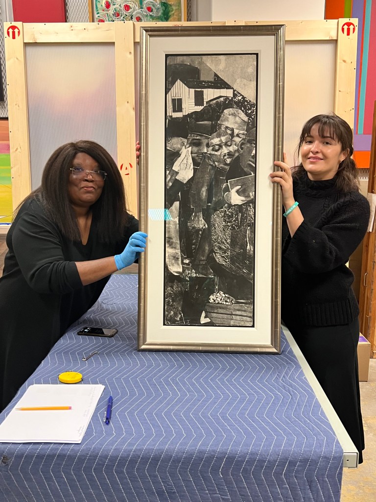 Examining Beardens with Catherine Huff at the Mint Museum of Art in Charlotte, North Carolina on March 17, 2023